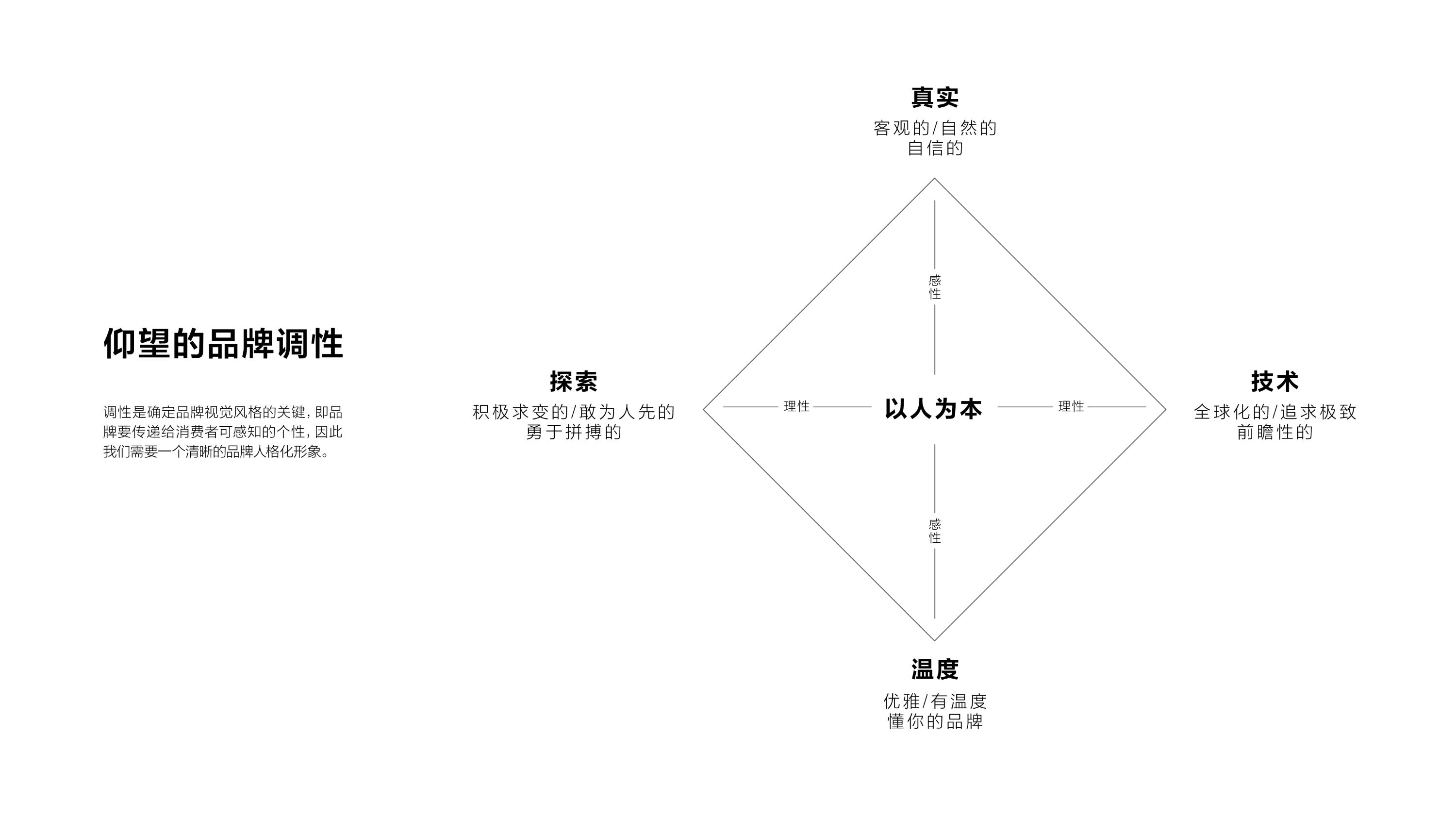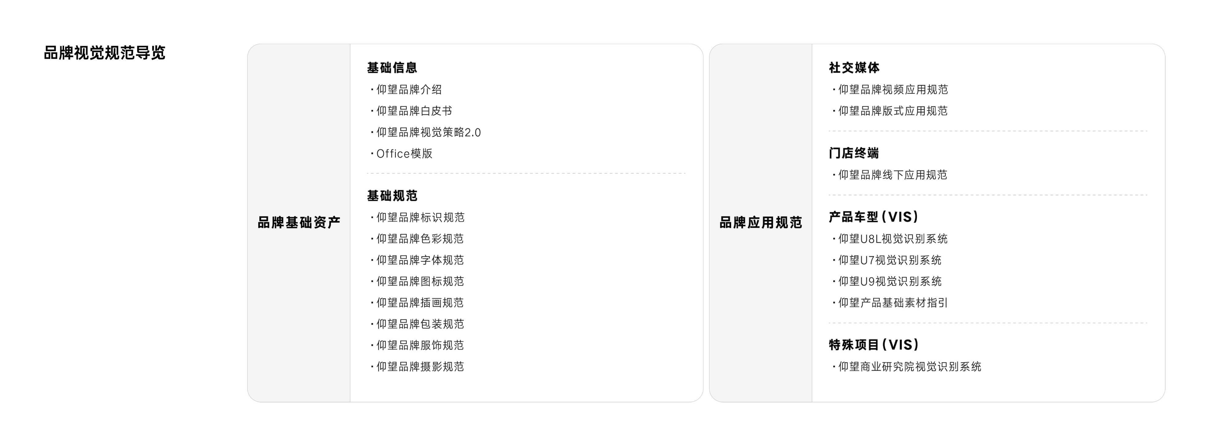 建立品牌认知:如何在市场中快速建立仰望独特且高端的第一视觉印象? 统一协作语言:如何让内外部团队对“仰望质感”形成统一认知,并能精准复现? 驱动有效落地:如何让设计规范不止于纸上,而是能灵活适应多场景,具备实际指导性?